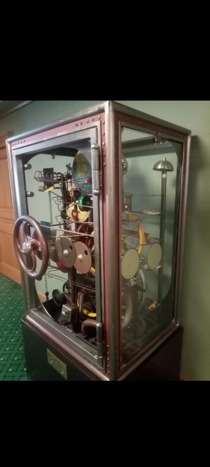 Made for a big bank in Geneva, this “safe-like” sculpture represents the company’s image with a world globe around which satellites interact with global finances.