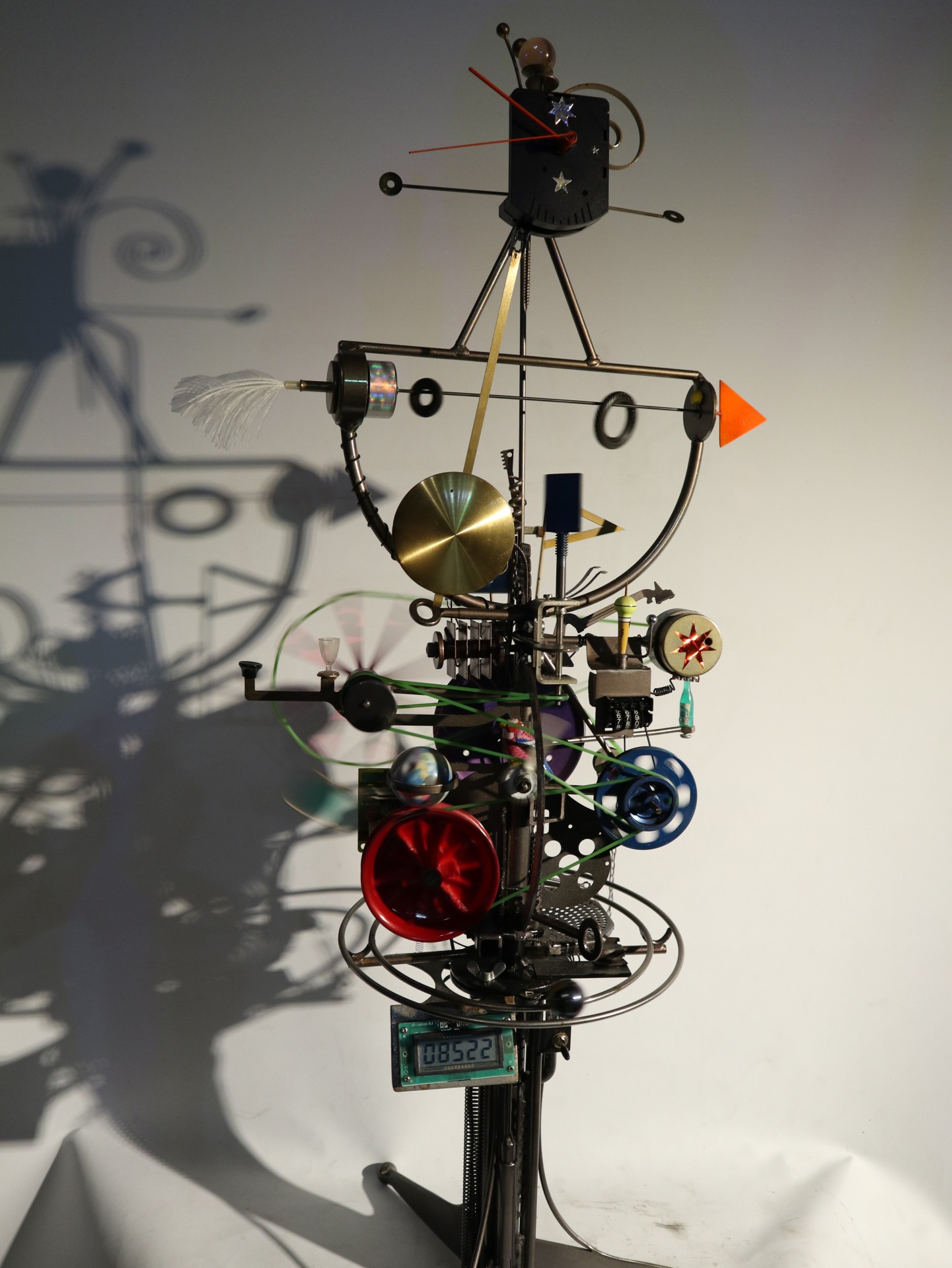 Ici j’ai essayé d’incorporer différents plans de mouvements fonctionnant à partir d’un moteur électronique vintage 10.5 volts Hauteur 55cm