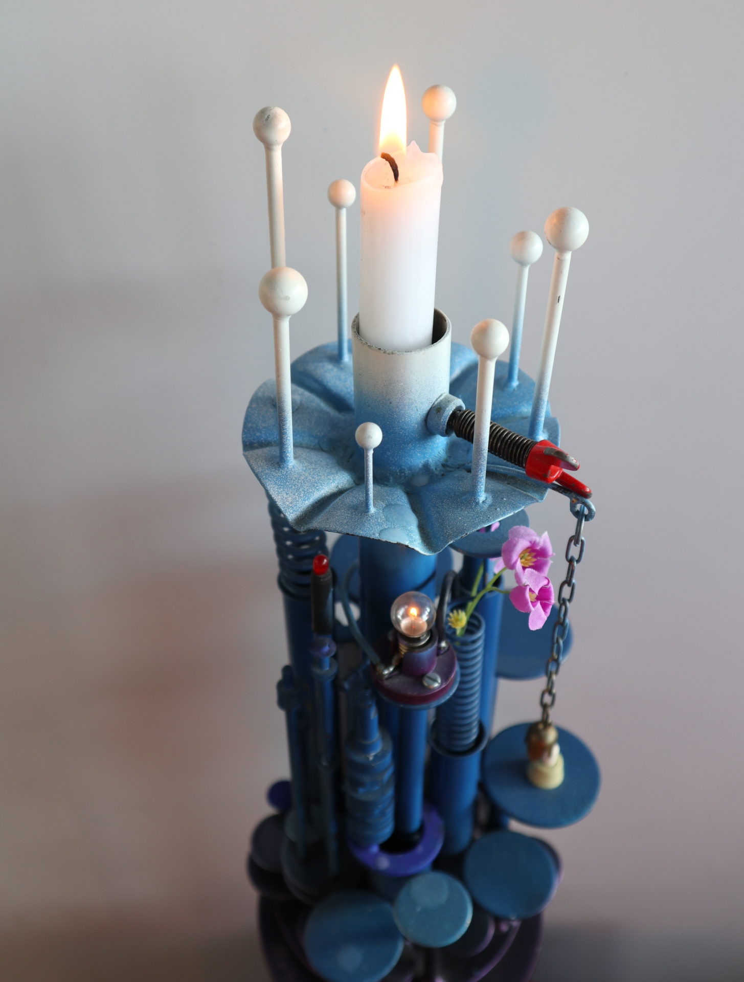 Bougeoir bleu acier de 2 kg avec une petite ampoule de 1,5 V et une led rouge clignotante. Fabriqué en 1991