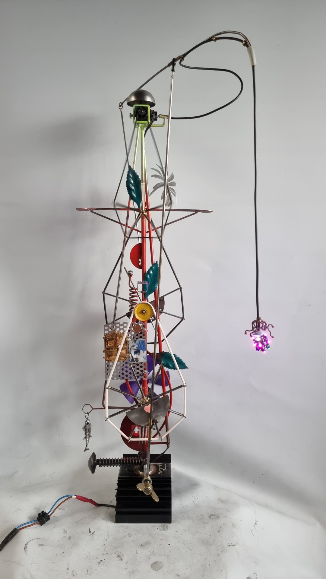 L’alimentation 12 volts active un moteur et des lumières RVB. La grappe luminescente se balance au hasard dans un silence complet. Hauteur 65cm